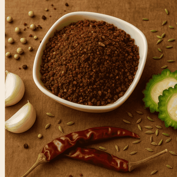 Kakarakaya Karampodi is for those who dare to love bold and bitter flavors. Bitter gourd (kakarakaya) is sun-dried and roasted before being blended with red chilies, dals, cumin, and garlic to create this uniquely flavorful podi. Though bitter, it’s incredibly healthy — known for managing blood sugar levels, aiding digestion, and detoxifying the body. Mixed with hot rice and ghee, or sprinkled on curd rice and poriyals, this karam adds a pleasantly sharp bite. It’s an acquired taste, but once you love it, there’s no turning back — it’s flavor with function.