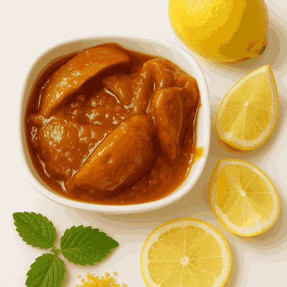 Lemons are cut into pieces, mixed with a blend of spices, and preserved to create a tangy and spicy pickle. Its sharp flavor enhances the taste of any meal, making it a staple in many households.