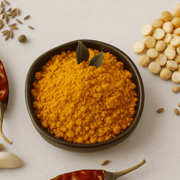 Creamy and mild, Putnala Podi is made from roasted Bengal gram (putnalu), coconut, garlic, and a touch of tamarind. It’s a favorite among kids and elders alike, thanks to its smooth texture and balanced flavor. Perfect with idli, dosa, or chapati—it’s also great for quick snack dips when mixed with curd or oil.